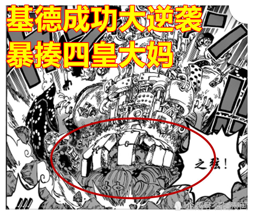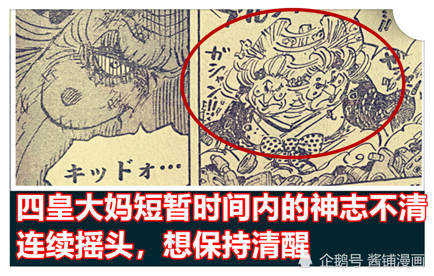 四皇大妈因为被攻击后,从地上坐起,使劲摇头,头摆得像个拨浪鼓般,显示出四皇大妈因为脑袋被撞击,出现了短暂的神志不清,看来基德蛮劲下的技能【磁气之弦】有效果。