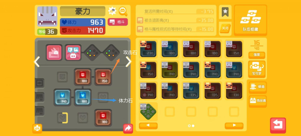 宝可梦身上的方石槽可以看成是装备栏,就是下面的九宫格。这九个格子前期只能开三四个,可以装备两种方石,一种是加体力的,一种是加攻击力的,还有一种不限制,既可以放攻击石,也可以放体力石,只不过这种方石槽比较少。如果是坦克类似的宝可梦,那肯定是体力石槽更多为好,因为这样就能装备更多的体力石,坦克毕竟是前排抗伤害的。如果是攻击型宝可梦,攻击石槽至少也要5个以上,对于近战型宝可梦来说,也需要三个左右的体力石,否则就太脆了,打BOSS时很容易死。
