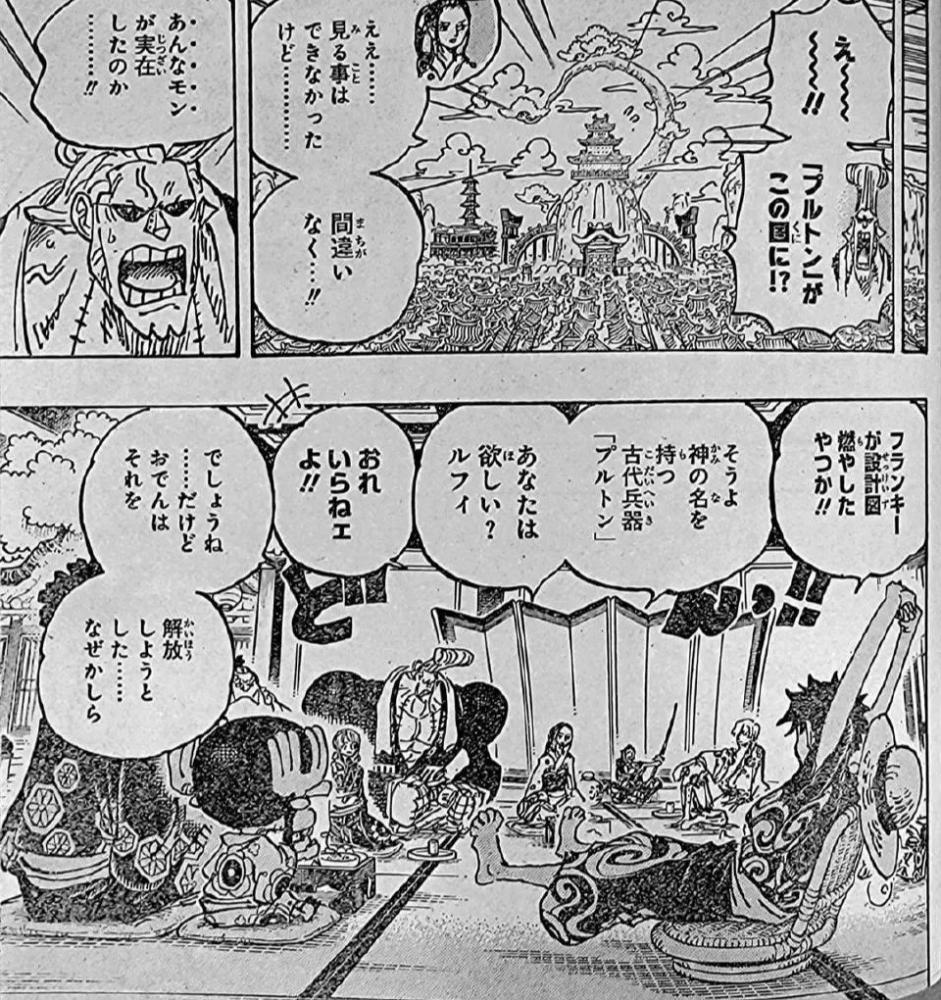 草帽一伙也在房间里讨论接下来的事情,路飞躺在一张椅子上伸懒腰,罗宾已经回到大家身边。罗宾跟大家说了关于天狗的身份,还有古代兵器冥王与红色石碑的事情。在和之国海底就藏有红色石碑和古代兵器冥王,众人很震惊,没想到和之国真的有古代兵器冥王。路飞忽然想起,在司法岛上,弗兰奇烧毁了古代兵器冥王的设计图。