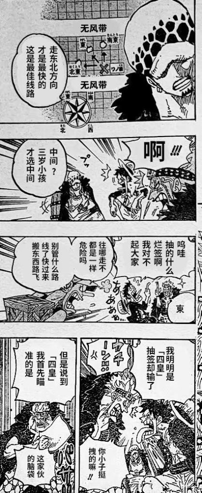 有意思的是基德和罗两人像小孩子一样,都选择了中间的道路,最终两人靠抽签的方式选出了道路,基德选择中间的道路,这让没能获得中间道路的路飞十分地自责,感觉对不起大家。