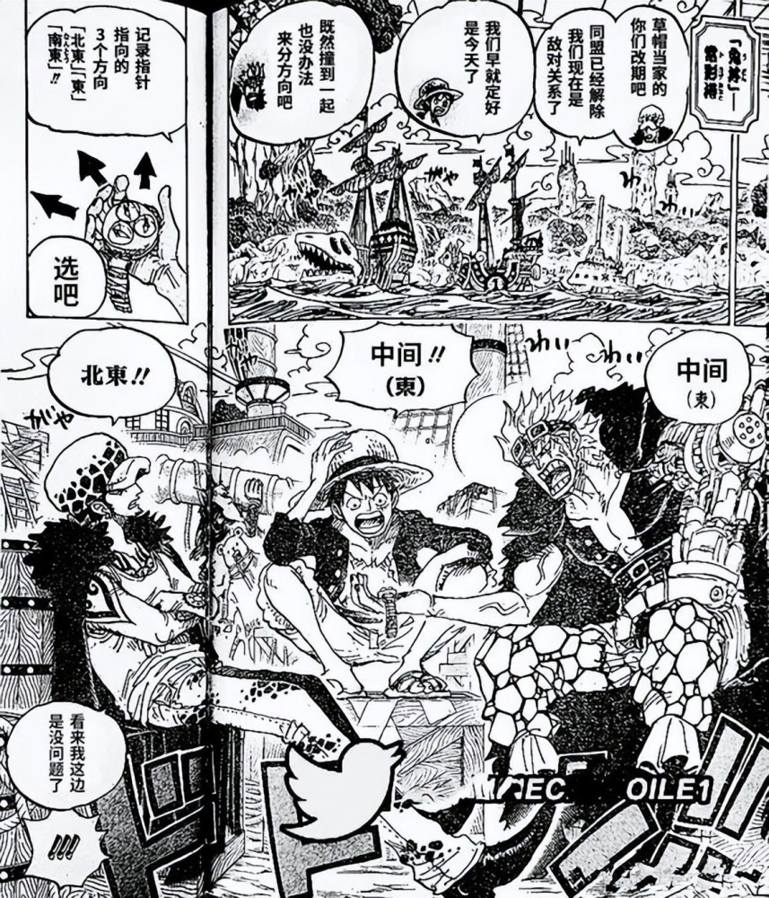 本期漫画之中,草帽海贼团、红心海贼团以及基德海贼团,三大海贼团选择在同一天离开和之国,这样的话,为了防止接下来他们航行的道路相同,正好现在的记录指针都有三个方向,所以一人选择一个方向就好了。