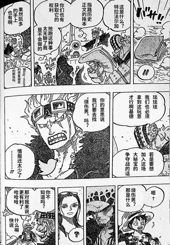 接下来是最后一块红色历史正文的消息,罗把得到的三块路标历史正文的消息与基德共享了,毕竟他们之前也算是短暂结盟了。而且有意思的是,基德似乎知道最后一块红色历史正文的消息,与一个叫“火烧男”的人有关。