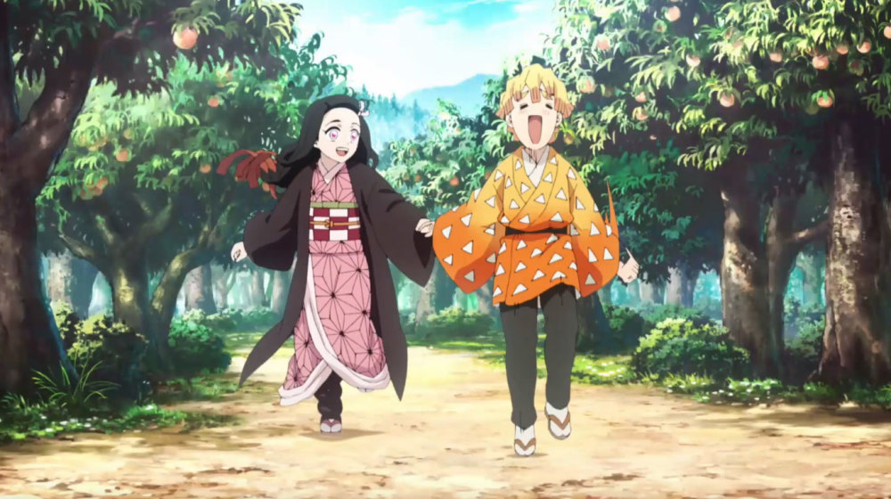 善逸的梦境里,是拉着祢豆子一起游山玩水(祢豆子团宠地位无法撼动,鱼糕队的梦境里都有她呢!),四周的景色都是欣欣向荣、赏心悦目的。