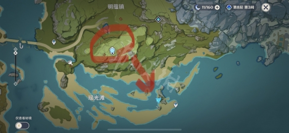 先传送到神像,然后再地图下方,有一座山头,飞到这个位置。