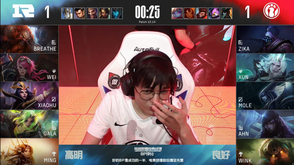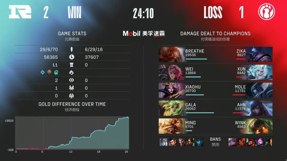 决胜局,RNG蓝色方,禁用滑板鞋,豹女,德莱文,赵信,加里奥,选用Breathe酒桶、Wei蔚、Xiaohu妖姬、GALA泽丽、Ming日女;iG红色方,禁用波比,岩雀,猴子,凯南,船长,选用Zika武器大师、Xun破败之王、Mole冰女、Ahn厄斐琉斯、Wink泰坦。
