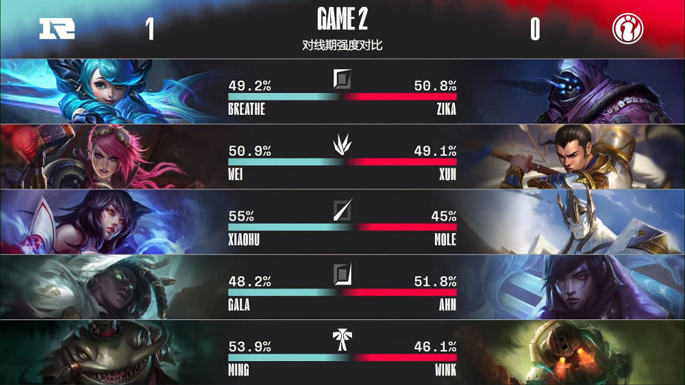 第二局比赛,RNG蓝色方,禁用滑板鞋,豹女,德莱文,冰女,妖姬,选用Breathe格温、Wei蔚、Xiaohu阿狸、GALA赛娜、Ming塔姆;iG红色方,禁用希维尔,泽丽,猴子,岩雀,波比,选用Zika武器大师、Xun赵信、Mole加里奥、Ahn厄斐琉斯、Wink泰坦。