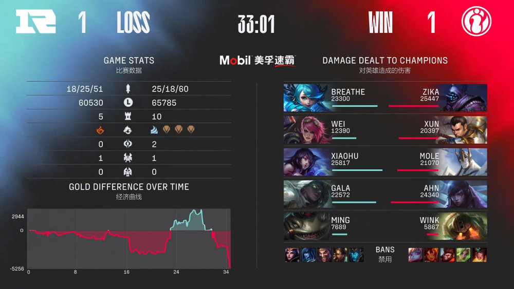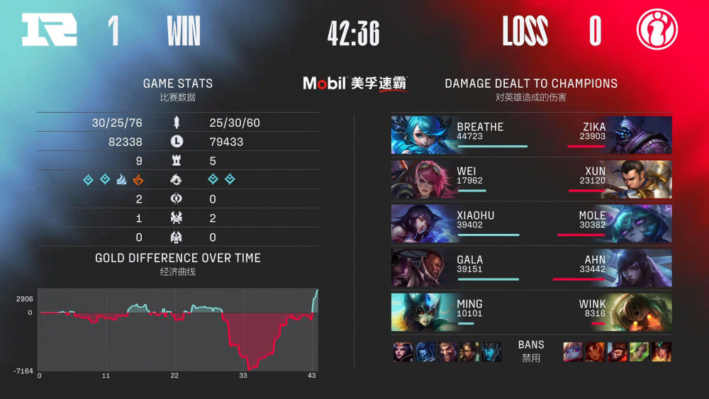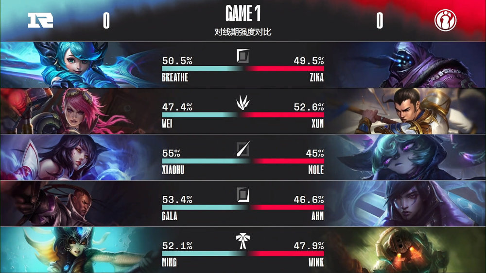 第一局比赛,RNG蓝色方,禁用滑板鞋,豹女,德莱文,冰女,妖姬,选用Breathe格温、Wei蔚、Xiaohu阿狸、GALA卢锡安、Ming娜美;iG红色方,禁用希维尔,泽丽,猴子,岩雀,波比,选用Zika武器大师、Xun赵信、Mole薇古丝、Ahn厄斐琉斯、Wink泰坦。