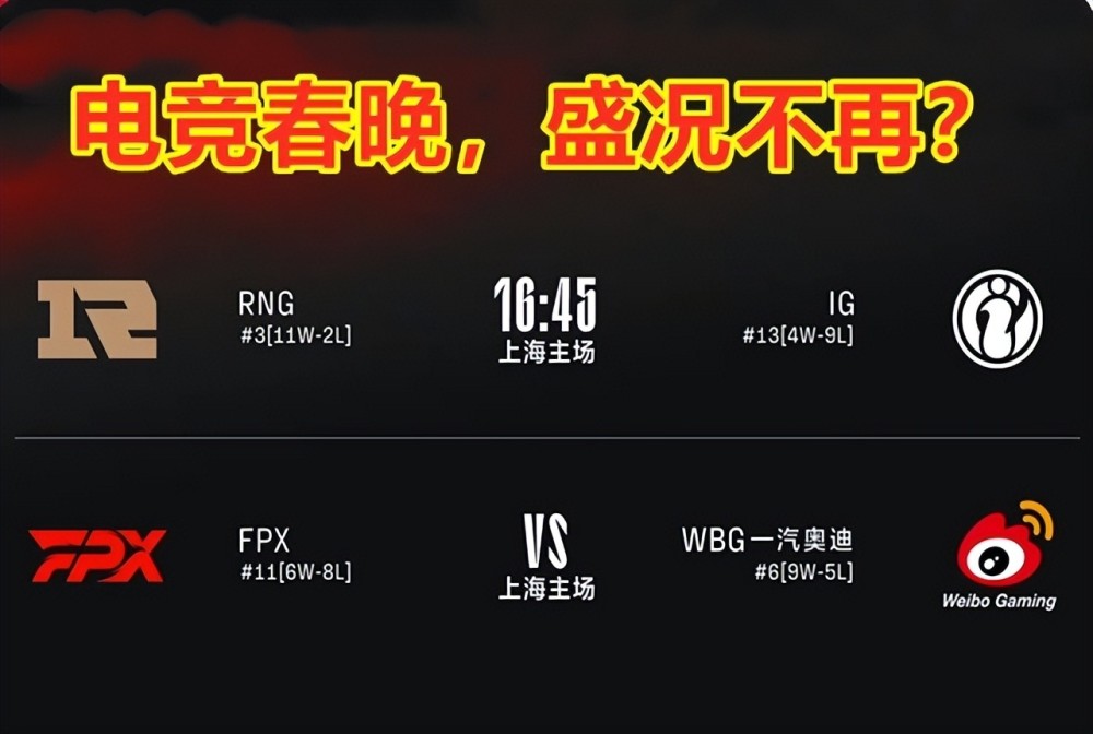 随后但凡是有iG和RNG的比赛,都被LPL粉丝们称之为“电竞春晚”。但是随着RNG队内UZI的离队,姿态,MLXG和让帝的退役;iG冠军阵容的星散;加之这两支队伍战绩和战力的悬殊之后,“电竞春晚”的热度已经大不如以往了。