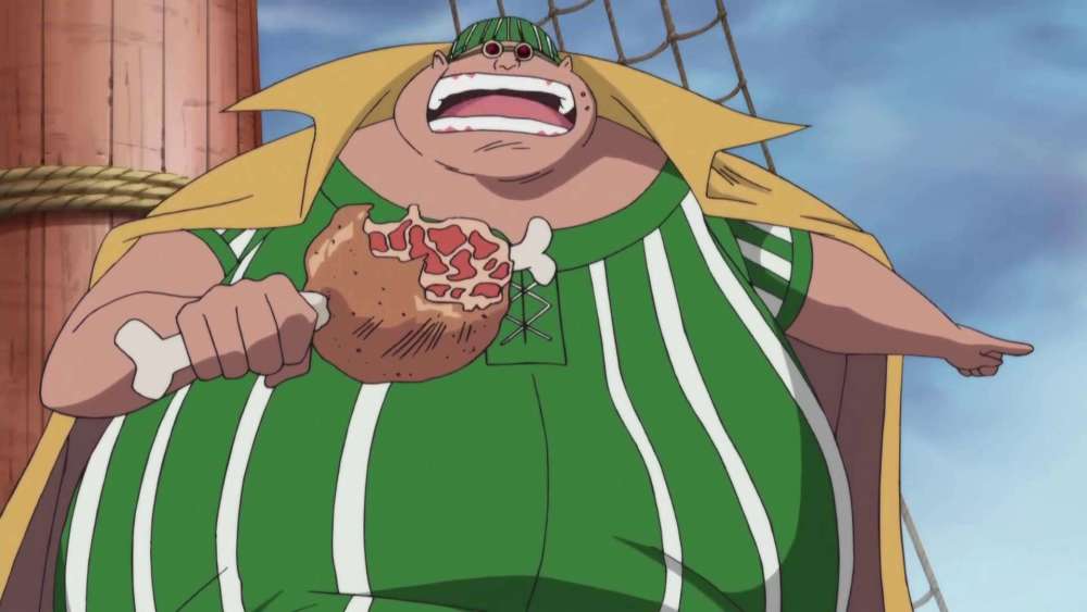 然后就是拉基路,他是红发海贼团的厨师,是一位即便在战斗中也连肉带骨头撑得腮帮满满的大胃王,宽阔的身躯是他的武器,脸上总是挂着爽朗的笑容,是同伴里的气氛带动担当。拉基路擅长的能力是霸气和人肉保龄球,性格不太擅长和女人打交道,和贝克曼刚好相反。