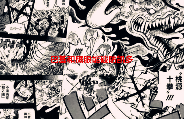 凯多不只是要面对鹰眼,巴基也不是省油的灯,凯多需要启动霸王色才能击中巴基,不然普通的攻击,对于四分五裂果实的巴基而言,那就是挠痒痒,鹰眼的斩击对巴基都无效,所以凯多的每次攻击都得要用上霸王色,但这同时也会消耗凯多的体能,鹰眼巴基俩人破防凯多根本不是问题。而且还没排除巴基和鹰眼也会觉醒,这样百兽团根本就没有赢的希望。