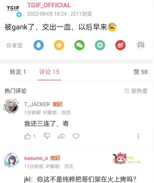 这段话让观众直呼“好活”,可惜,这个开团视频留存的时间很短,被发布者自己删掉了。随后,这个品牌发文表示:被gank了,以后想看的话早来。大概是LPL找他们谈话,不得不删掉视频。