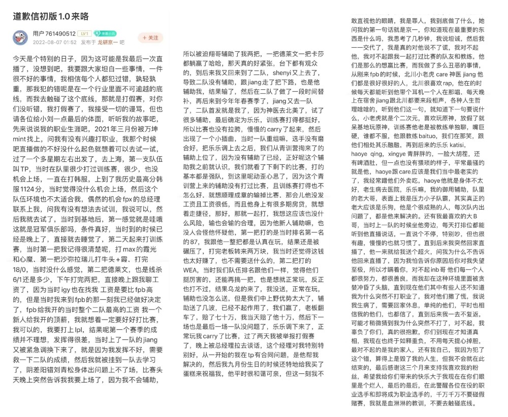 今天凌晨前FPX队员Jingyi在鱼吧发布了道歉信,表示在自己参与了假赛: