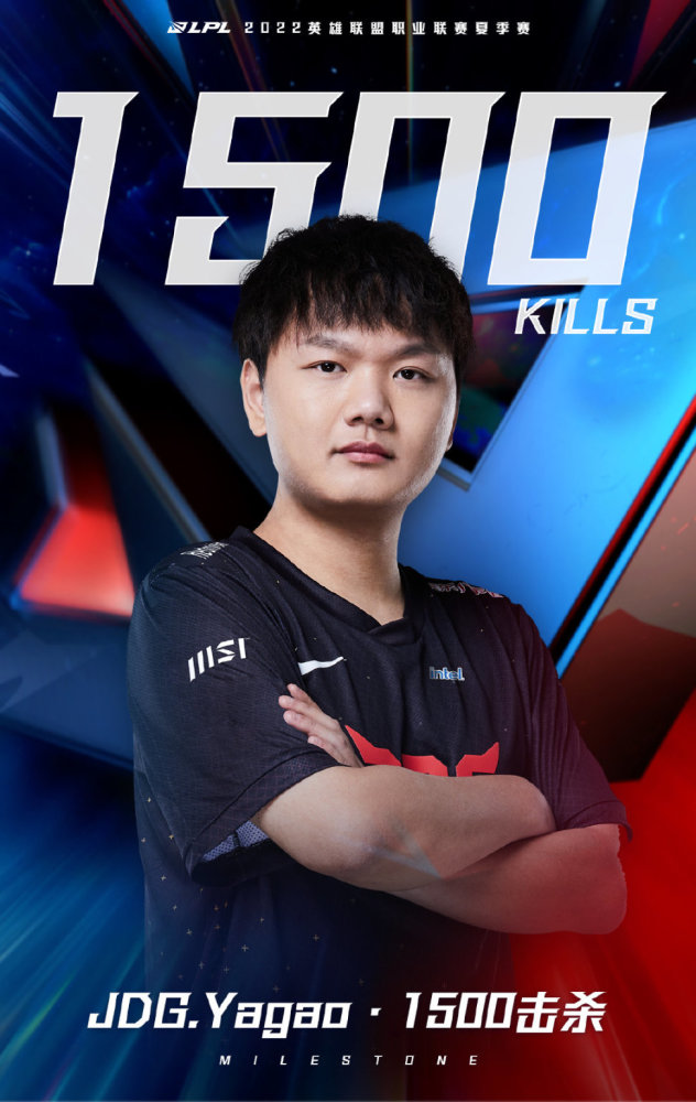 在今天JDG对战AL的第一局比赛中,JDG中单Yagao达成了LPL 1500击杀里程碑。