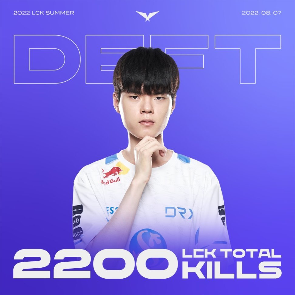 在今天DRX对阵KDF的比赛中,DRX下路Deft达成了LCK 2200击杀里程碑,目前他在击杀榜上排名第二,第一名是Faker的2651击杀。