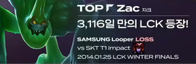 在今天T1对阵NS的比赛中,T1上单Zeus选用了扎克,这是扎克时隔3116天再次以上单位登上LCK赛场,上一次是Looper在2014年1月25日选取。