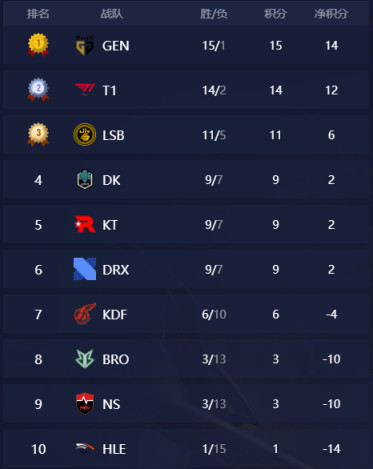 在今天的LCK比赛结束后,LCK季后赛参赛队伍已全部出炉,包括GEN.G、T1、LSB、DK、KT、DRX,由于赛程仅剩三轮,因此GEN.G和T1确定将从季后赛第二轮开始参赛。