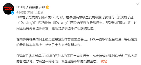 FPX随后发布超话,表示二队在参加LDL期间,发现JingYi和why存在异常行为,因此立即将两人停赛,并随后解约涉事选手。同时表示已将相关情况上报官方,将积极配合调查。