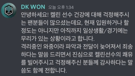 一个星期前,DK表示中单ShowMaker和辅助Kellin确诊新冠,今天DK又对Kelly的状况进行了补充: