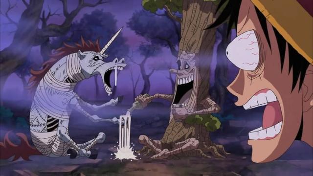 在恐怖三桅船篇中,草帽一伙为了寻找失踪的娜美乔巴和乌索普,在森林里遇到一只独角马和一个树精在一起喝酒,见到这种古怪情景的路飞就像发现新大陆一样,十分兴奋开心,当时就说你们跟我一起当海贼吧!看索隆和山治的表情也知道结果肯定不行。