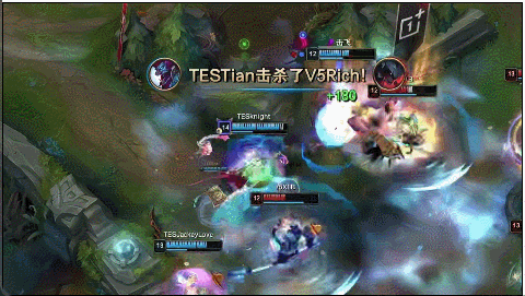 V5是成功拿下了下路的一血塔,TES则是中野配合试图越塔下路的Rookie,但V5马上支援,剑魔TP,Knight妖姬进场被Rookie的E躲掉技能,后撤过程中被V5剑魔留住,V5砍瓜切菜打出了0换3,一波建立了巨大的优势。