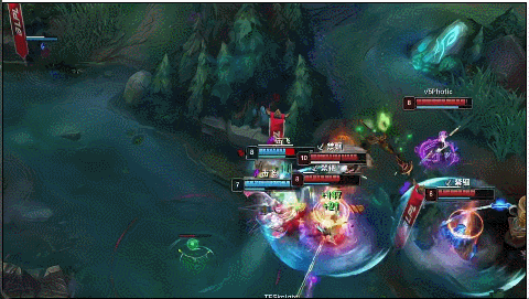 然后就是各种团战,TES的这个阵容劣势被体现得淋漓尽致,V5的这个下路双治疗组合效果非常好,阵容搭配非常扎实,打团就很难突破V5的阵型。