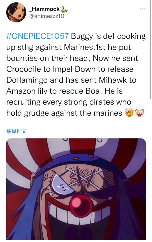 还有鹰眼去营救女帝汉库克。这个的可能性稍微有一点可能性,因为尾田早就说过【汉库克会啊啊啊】,情况不乐观的她或许会出现在报纸上,所以让鹰眼去解救汉库克并让她加入这个团队,是否有可能呢?