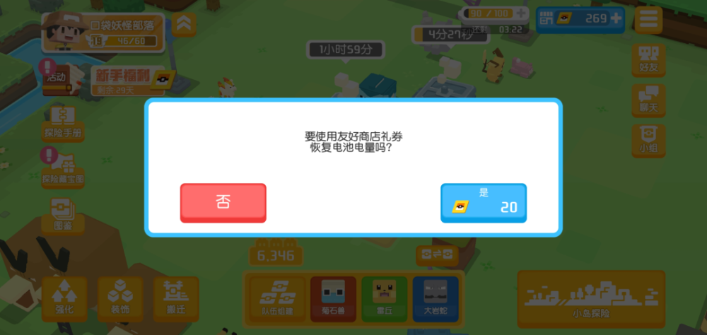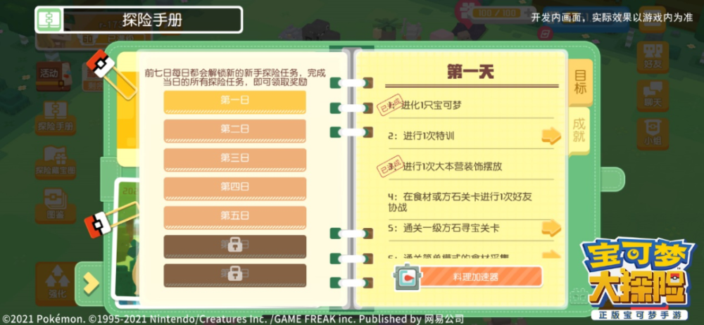 探险家们登上方可乐岛后会得到探险手册的全方位指导,度过新手迷茫期。探险手册中罗列了每日推荐探险家去完成的任务,例如进行特训、进化等,进一步帮助探险家快速掌握探险技巧。