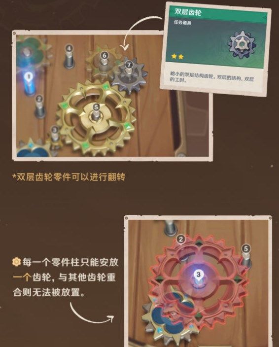 ·不在同一层的齿轮之间无法直接接合,旅行者可以通过切换查看上、下层来判断如何安放齿轮;