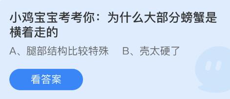 蚂蚁庄园8月13日给大家带来了问题:【为什么大部分螃蟹是横着走的?】,生活中人们遇到的大部分螃蟹都是横着走的,那么接下来小编带来了今日的答案,一起和小编来看看吧。
