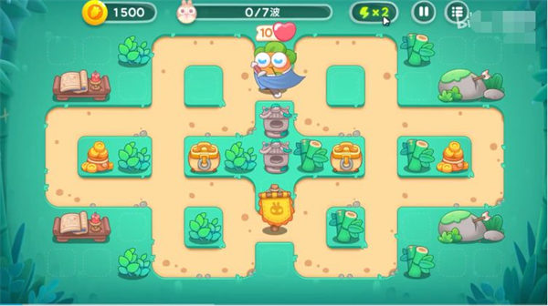 1、首先开局先建一个风扇和一个炮塔,风扇可以在打兔兔的同时亲历障碍顺便开图。