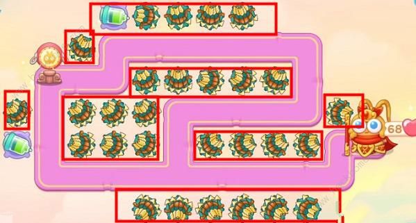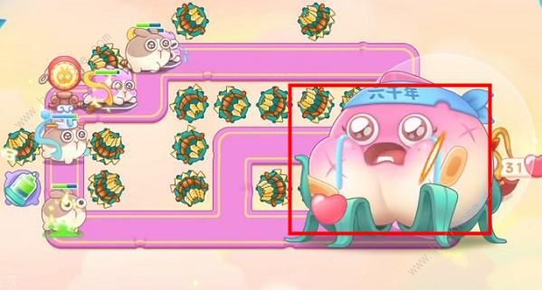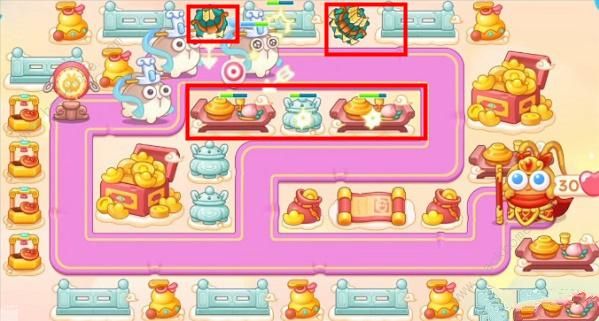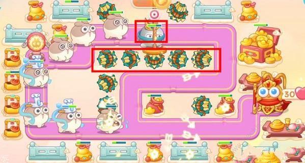 3、前期只需要赚金币即可,这一局玩家需要小心绳索兔,绳索兔比较多因为绳索兔下来时防御塔不会打,玩家需要点击集火。