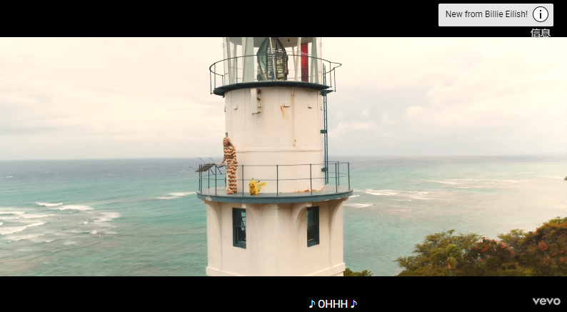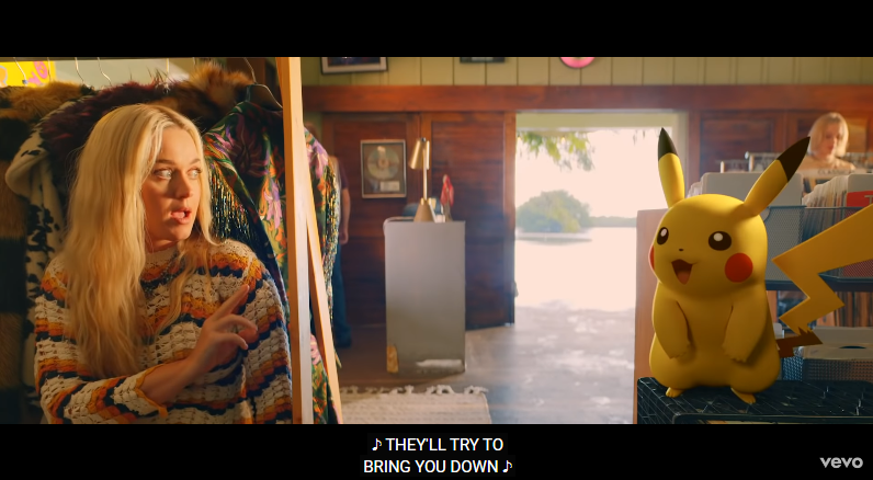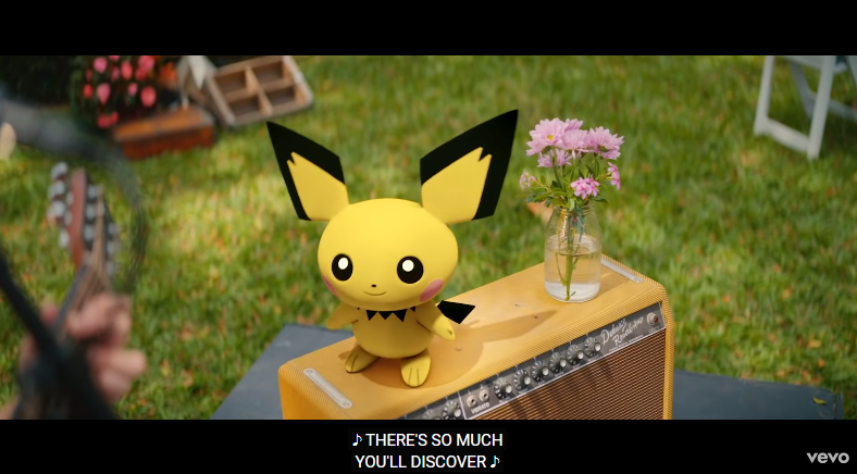 MV讲述了关于时间穿越的故事,在有魔力的皮卡丘的协助下,水果姐伴随电流闪动回到过去,帮助年轻的自己以及皮卡丘的精灵伙伴找到自信。我们看到了青涩版还在驻唱的水果姐,皮神的镜率也很高,活泼可爱。其中,穿越回去的第一个场景有点像《时空特警》,除了没警察。毕竟大牌制作与投入,个人感觉,这首曲子比宝可梦其他歌曲好听。