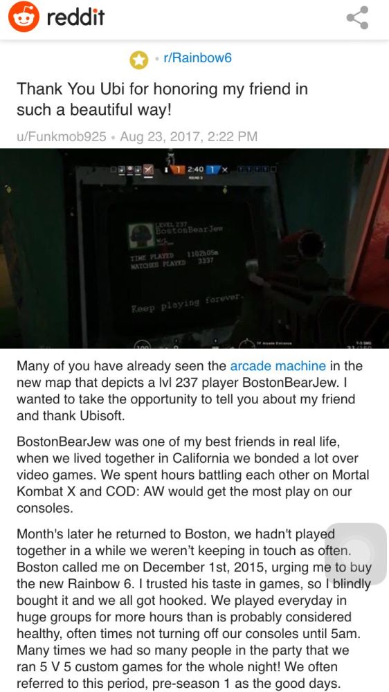 这位玩家不幸离世后,育碧官方决定在新地图中加入这个彩蛋来纪念他的朋友。