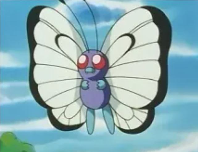 在收服宝可梦中,小智在没有使用宝可梦对战的情况下,成功收服了绿毛虫。与火箭队的战斗中,绿毛虫表现英勇,当小霞想要摸绿毛虫时,绿毛虫进化成了铁甲蛹。一只大针蜂向被石头绊倒的小智袭来,铁甲蛹奋力跃起挡住了攻击并打断了大针蜂的针,但也因此在蛹的表面划出一道缺口。就在小智为铁甲蛹担心时,铁甲蛹进化成了巴大蝶,