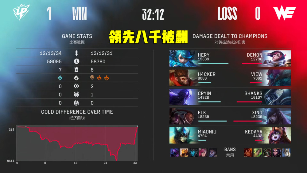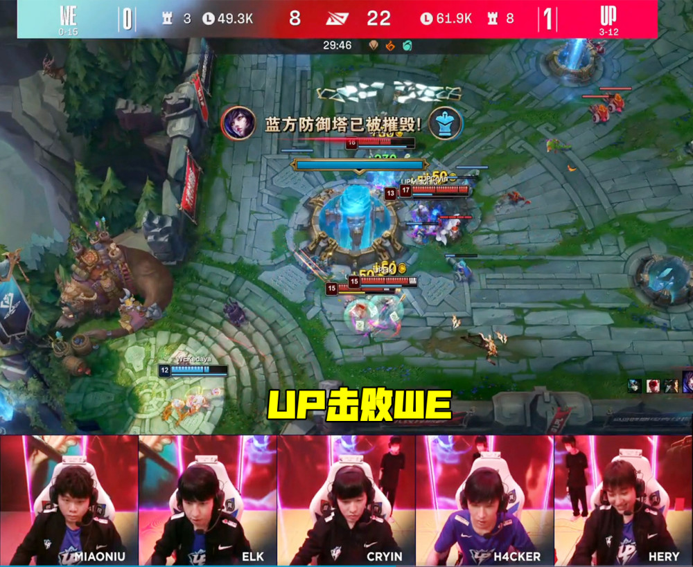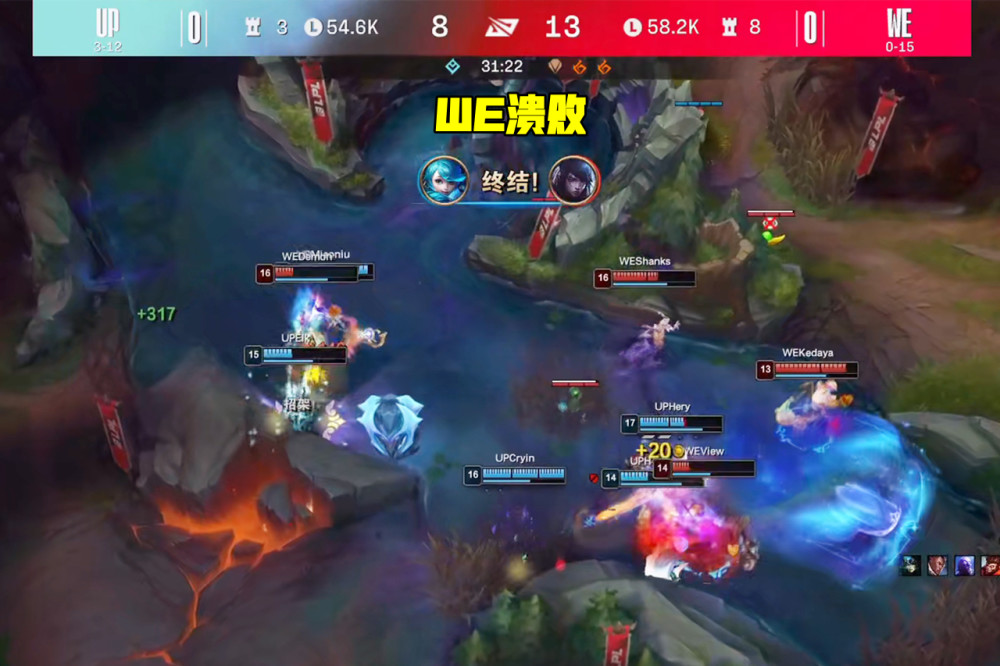 此时管泽元发了一个“就”字,WE推进高地立马给了机会,UP击杀四人顶住攻势,后期WE视野出现问题,最后一波骇客绕后控死AD,UP零换五完成翻盘!WE领先八千都能输,管泽元再次毒奶成功,MVP给到新人小将Hery的格温。