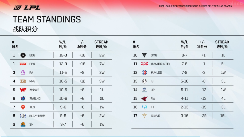 WE成为LPL史上第二支常规赛全败队伍,2020春季赛V5战绩0-16小分负31,仅赢了LNG一个小场;2021夏季赛V5战绩0-16小分负29,仅赢了JDG、SN、OMG3个小场。WE0-16小分-25的成绩倒数第三,呈现这些数据当然不是为了比烂,希望WE管理层、教练以及选手能好好反省,建议基地里全部贴满积分榜!