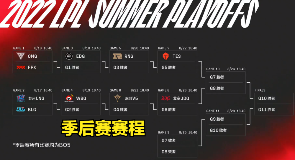 根据LPL官方公布的赛程,上半区的队伍为:OMG,FPX,EDG和RNG。下半区的队伍为:LNG,BLG,WBG和V5。在8月16号,也就是明天下午5点,会迎来夏季赛季后赛的揭幕战:OMG对FPX。对于这两支战队来说,如果这场BO5输了,确定没有足够的积分去打冒泡赛,将确定无缘本次S12。如果这场BO5赢了,将直面下一个对手:EDG。其余战队赛程可以参考赛程表。