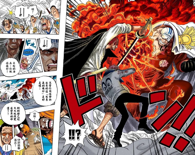 在之后的顶上战争中,赤犬打算用岩浆拳终结前来劝架的克比,就在拳头即将落下来时,被红发的刀及时挡住。这里赤犬的表现相当耐人寻味,他先是惊讶,然后慢慢抬头才发现突然面前的红发。动画版对这一幕刻画得比较细致,感兴趣的小伙伴不妨找来原片看看。