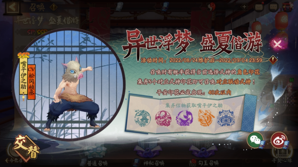 即可定向召唤SSR嘴平伊之助