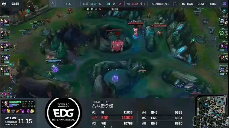 11.15版本是2021年7月20日更新的,再看一下比分,EDG2-1LNG,而且比赛还在进行,应该是季后赛的BO5,再根据英雄选择,确定是2021年8月26,LPL夏季赛季后赛,EDG3-1LNG的第四局。