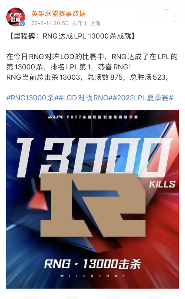 不过这算是他们的一个“里程悲”,因为官方给出的数据显示,RNG在这场BO3的第二局,拿下12个人头后,他们在比赛中达成了13000的总击杀数,位列LPL队伍第一名。