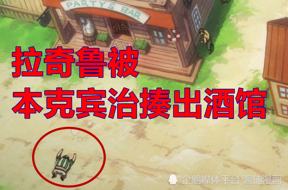 结果,【拉奇鲁】与【本克宾治】立马歇菜,转到桌角一旁默不作声,可见路飞最初的引路人是【拉奇鲁】与【本克宾治】,他们两个事先见到路飞,一直在路飞面前说当海贼很开心。