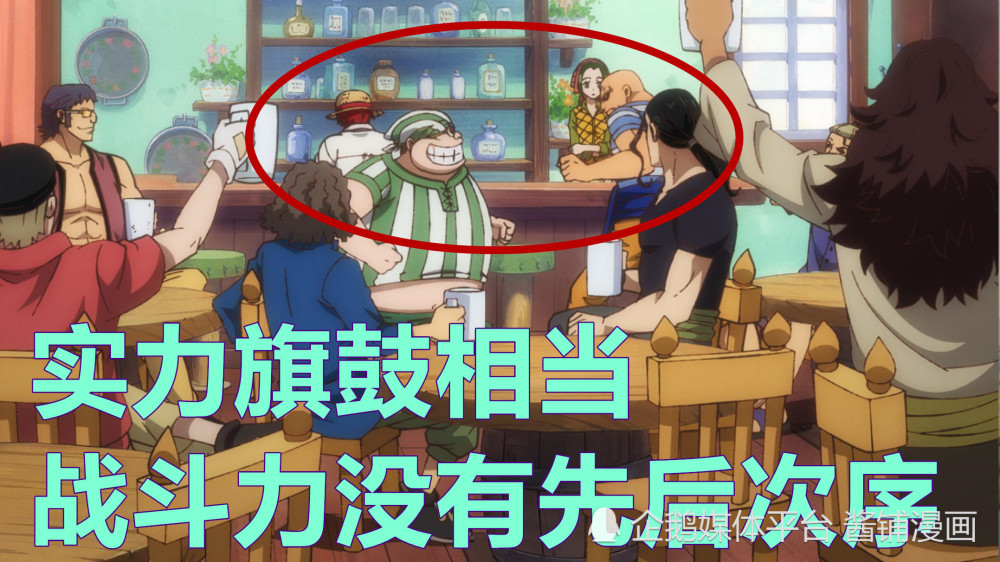 此时的厨师【拉奇鲁】正与伙伴【本克宾治】比武,【拉奇鲁】一度被揍出了酒馆外,两人拳拳到肉,但都像没事人一样,这说明【本克宾治】,【莱姆琼斯】,【怒吼噶布】这些人并没有实力差别,每个家伙的战斗力都旗鼓相当,战斗力上没有先后次序。