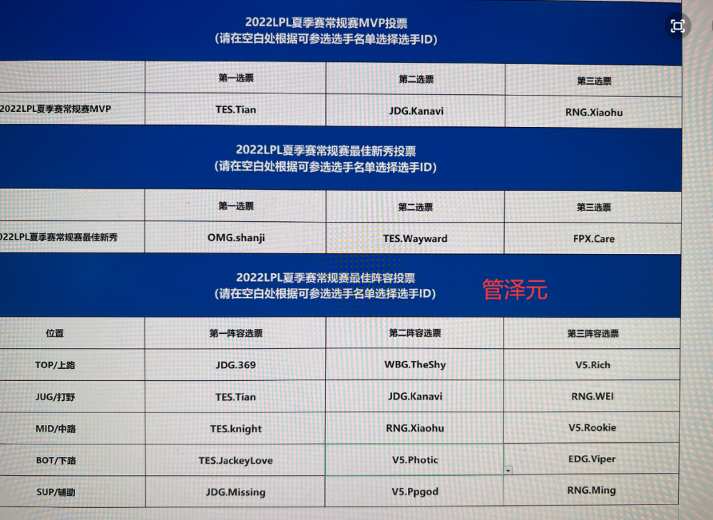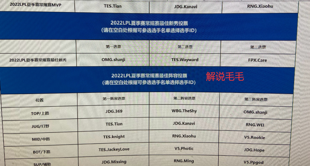 不过我们前面也讲了,所有的粉丝投票最后会汇总成1票,因此影响力非常有限,基本就是让粉丝有点参与感。对于最佳阵容评选影响最大的肯定还是专业人士投票,他们每个人都有一张选票表,一个人的影响力就堪比全网的观众,而这些专业人士基本就是由LPL解说、工作人员还有媒体人组成,下面我们看一下部分公布自己投票的专业人士。