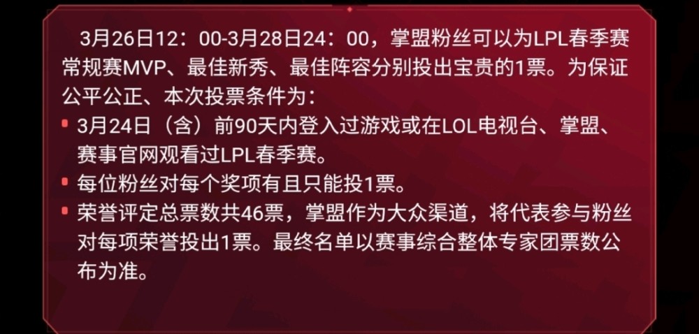 另外的45票由45位专业人士投出,也就是说成千上万的大众评审只占总票数的1/46,有一点用,但也没卵用,这也算是尽可能地杜绝拉票行为让LPL过于饭圈化。