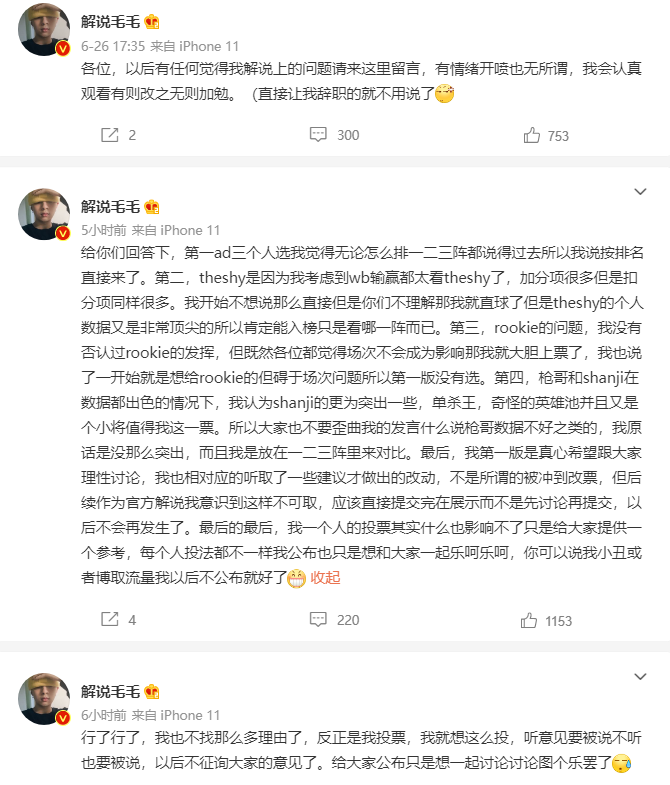 三位解说的一阵投票英雄所见略同,不过解说毛毛因为自己在二三阵的投票结果收到很多网友的质疑。