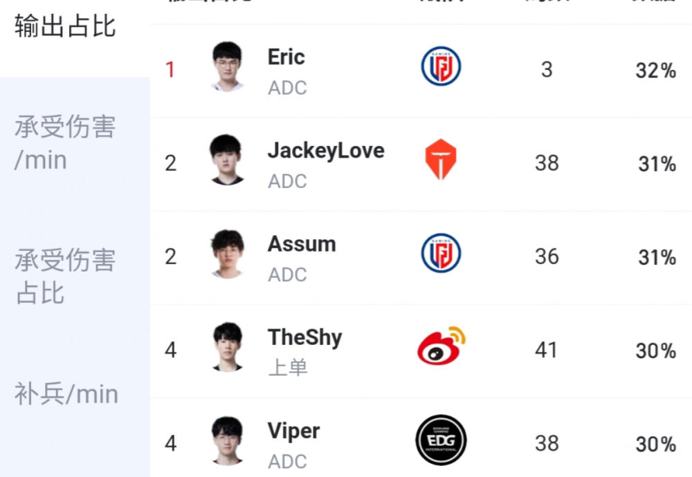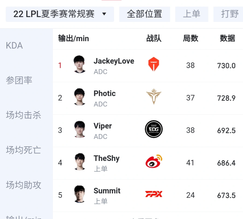 但最值得关注的并不是这件事情,而是Shy哥的分均输出竟然依然是上单位置的第一名,排名第二的是FPX的上单选手summit。如果单单是这样的我们最多只会感叹一句Shy哥打伤害的能力还是猛,但其他位置上的分均伤害第一就非常有趣了。中单位置上的分均伤害第一竟然依然是征战多年的肉鸡,而不是被誉为未来可期的左手。更让人无语的是ad位置上的伤害第一竟然还是当年IG的三叉戟一员。