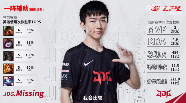 辅助我在Ming和Missing之间有过纠结,但我最终会给到Missing,因为我评一阵名单的时候会更看重一个选手相比较他自己之前有没有进步或者说突破,像69哥啊、Photic他们相较于自己之前的表现确实是有很大的突破的。我们说这赛季JDG打得这么好,目光会放在69哥、Kanavi身上,但Missing也是一个无名英雄嘛,而且我跟WE那些名宿聊的时候他们说,其实Missing出走对于WE来说是非常伤的,虽然去年WE是‘售票员’,但至少是能打到LPL冒泡赛的强队,今年Missing一走我感觉WE缺少一个灵魂,而对于去年的‘WE 3.0’来说Missing是一个绝对的团队大脑,今年他也把指挥调度的智慧带到了JDG,很好地接过了老队长LvMao的班,对于今年JDG能保持这么好的成绩也起到了一个关键作用。