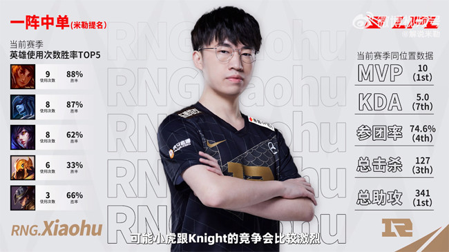 中单位Xiaohu和knight的竞争会比较激烈,我更倾向于给Xiaohu,因为我觉得他比较厉害的点在于,他相较于knight对于整个团队的帮助性会更大一些,他的岩雀会让整个RNG很有安全感,对线期如果队友有危险,他的岩雀总能挺身而出,然后去拯救队友,包括RNG打EDG那个大翻盘,Xiaohu的岩雀也打出了非常亮眼的表现,所以我觉得Xiaohu在对于团队的重要性上会更关键一些。而且Xiaohu去年转上单,今年又转回中路,这一整年的表现都很亮眼,这赛季就是值得‘最佳中单’的一个名号。
