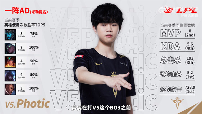 下路竞争激烈的是Photic和JackeyLove两位选手,我觉得在TES打V5之前,JackeyLove的一阵的胜算比Photic高,但打完这个BO3的话我更倾向于给Photic,原因就是在和JackeyLove的正面对决里他的表现更亮眼,也更稳定一些,他的赛娜、卢锡安的表现就证明了,他在夏季赛的发挥是一直和春季赛是在同一水平线上,而且现在V5上路Rich使用的都是偏坦克英雄,把输出重担交给了双C,因此夏季赛Photic的担子会更加重一些,但是他很出色地完成了自己的任务。现在的Photic绝对不是两三年前的他,已经是一个独当一面的ADC,而且英雄池也非常深厚。